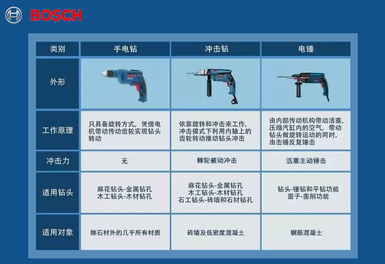 在博世的電動(dòng)工具中,大家記住GBM系列為電鉆、GSB系列為沖擊鉆、GBH系列為電錘就可以了。